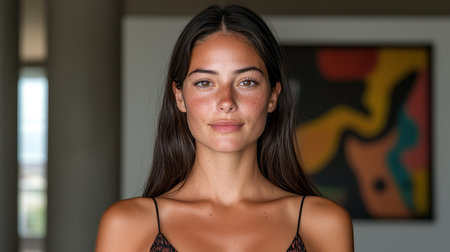 A woman stands against a green wall with a serious expression on her face. Her long hair is styled neatly. The background adds a simple touch to her appearance.
