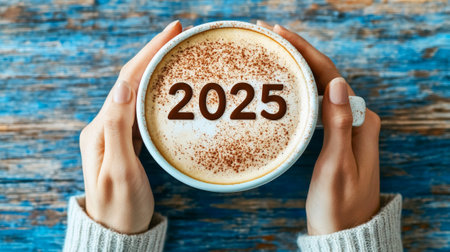 A cozy moment unfolds as hands cradle a steaming coffee mug, with 2025 elegantly dusted on the surface, set against rustic wood tones.