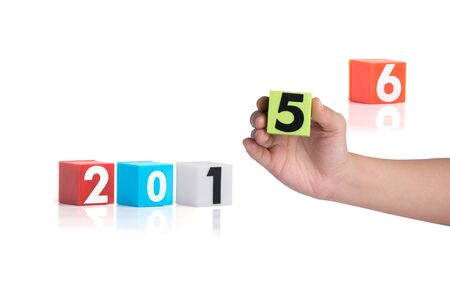 Hands holding new year 2015 placard on the white background.