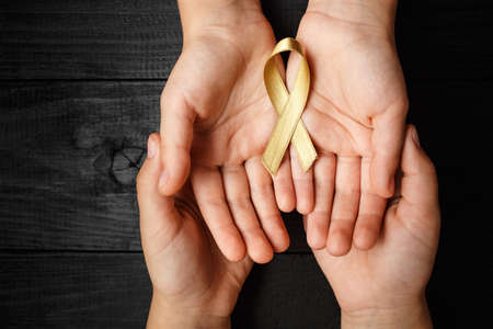 golden ribbon childhood symbol of the fight against cancer in children in hands on a dark background. concept of helping patients with sarcoma and bladder cancer