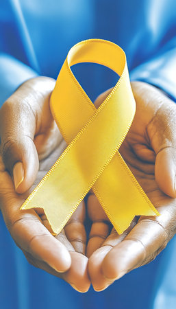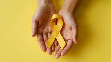 Two hands gently hold a yellow ribbon, representing solidarity in the fight against cancer. This powerful symbol embodies hope, support, and awareness in the ongoing battle against illness.