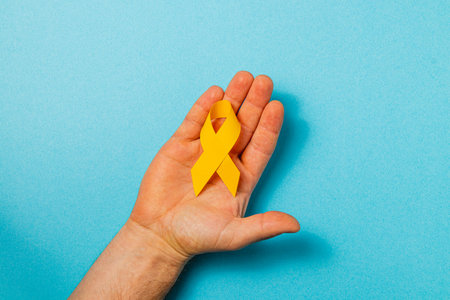 A hand holds a yellow ribbon symbolizing support and awareness for cancer. This represents hope and solidarity in the fight against illness, emphasizing the importance of prevention and care.