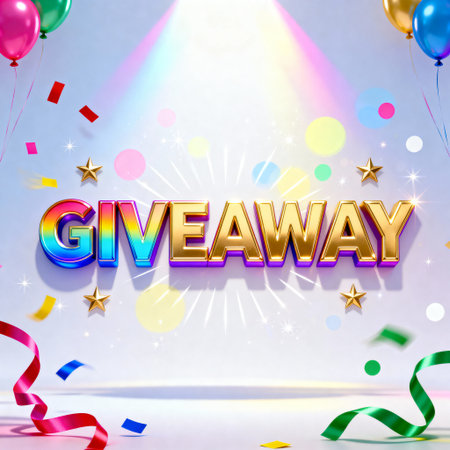 Colorful giveaway text with festive balloons, confetti, and stars on gradient background, perfect for contest, promotion and celebration campaigns.