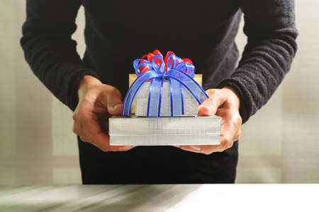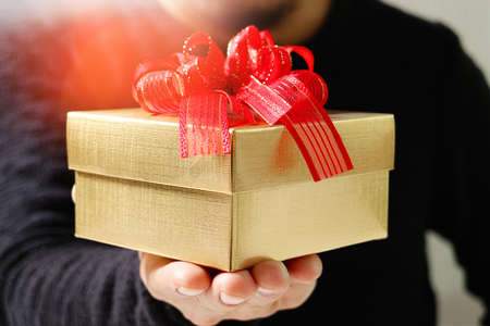 gift giving,man hand holding a gift box in a gesture of giving.blurred background,bokeh effect