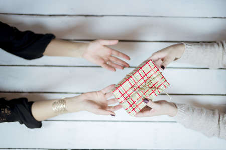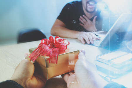 Gift Giving.business creative designer hand giving his colleague Christmas present in office,filter film effect