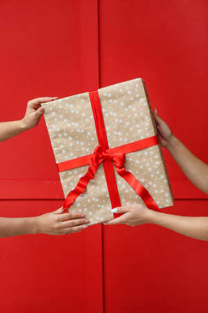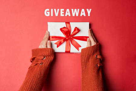 Christmas giveaway concept. Woman hand in sweater holds a Christmas gift on red background. Christmas giveaway gift