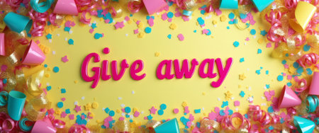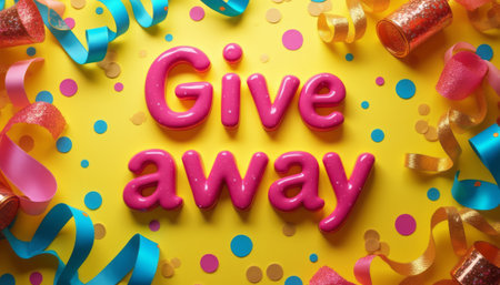 A vibrant yellow background showcases bold pink letters spelling Give away, surrounded by colorful confetti and festive ribbons. This lively composition radiates excitement and joy, perfect for promoting a fun event or celebration.