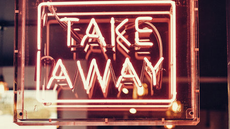 A glowing neon sign displays the words TAKE AWAY in vibrant red light, framed by a clear glass enclosure.