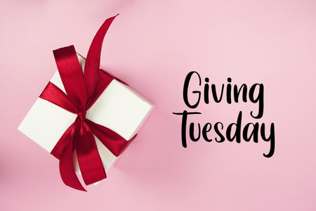 Giving Tuesday text with gift box present on pink background
