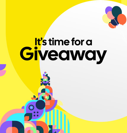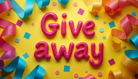 A vibrant yellow background sets the stage for the bold pink letters spelling Give away, surrounded by colorful ribbons and confetti. This cheerful composition radiates excitement and invites viewers to participate in a fun giveaway event.