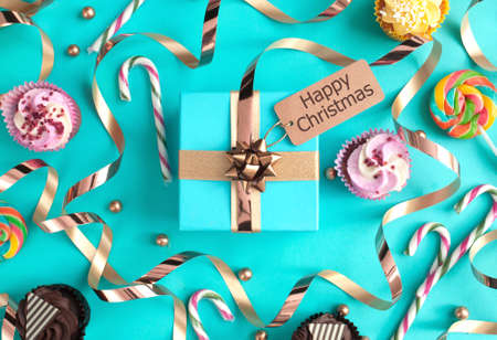 Gift box wrapped in gold ribbon with christmas greeting, surrounded by sweet treats including cupcakes and candy
