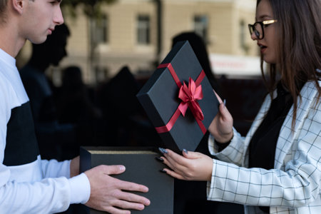 Portrait of young couple with gift. Guy congratulates girl and gives present.