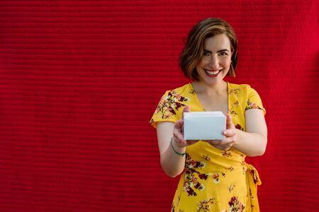 pretty woman with white gift box in hands, yellow dress and red background