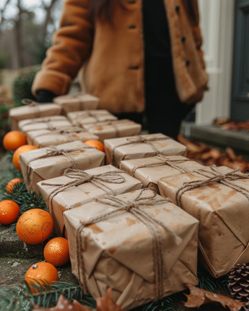 Gift boxes wrapped in natural materials and twine sit on a wooden table, creating a cozy atmosphere for a special occasion or celebration.