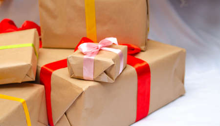 gift boxes with ribbons on a white background. selective focus