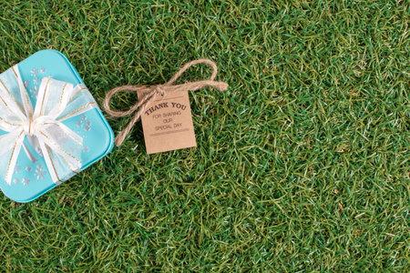 The gift box with tag on the grass ground