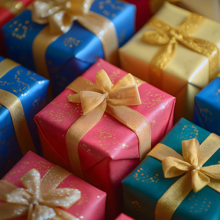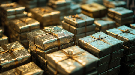 Close-up view of many beautifully wrapped presents tied with golden bows. Perfect for festive celebrations and gift-giving.