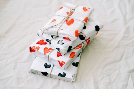 a stack of gifts wrapped in homemade wrapping paper with red and black hearts tied with jute thread for Valentine's