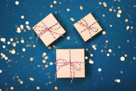Minimalistic Christmas gift wrapping on the blue background.