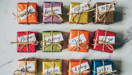 Various gift boxes with intricate designs and colorful bows signify a festive celebration or special occasion.