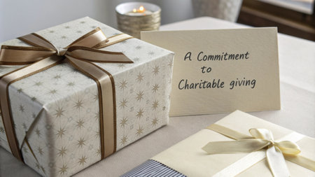Gift Box with a Charitable Note A beautifully wrapped gift box accompanied by a handwritten note stating a commitment to charitable giving..