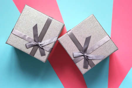 Two silver gift boxes on a blue and pink background. Flat lay
