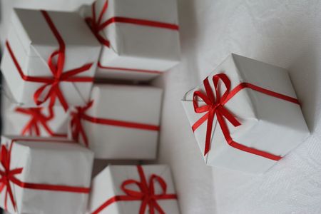 Holiday gift delivery service. Top view of red paper boxes tied up with white cord.