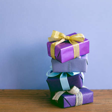 Gift boxes on wooden table. purple wall background. christmas birthday new year concept