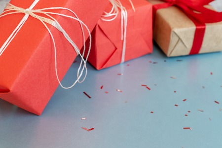 Red and kraft wrapped gift boxes on blue background with copy space.