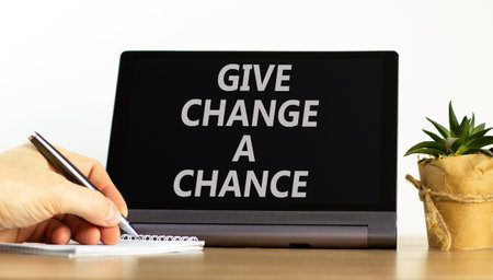 Give change a chance symbol. Concept words phrase Give change a chance on beautiful black tablet. Businessman's hand. Beautiful white background. Business Give change a chance concept. Copy space.