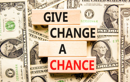 Give change a chance symbol. Concept words phrase Give change a chance on beautiful wooden blocks. Dollar bills. Beautiful dollar bills background. Business Give change a chance concept. Copy space.
