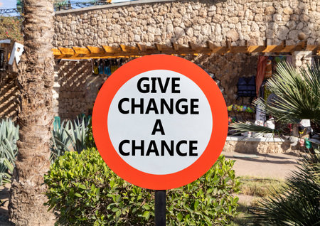 Give change a chance symbol. Concept words phrase Give change a chance on beautiful road sign. Beautiful palm tree background. Business Give change a chance concept. Copy space.