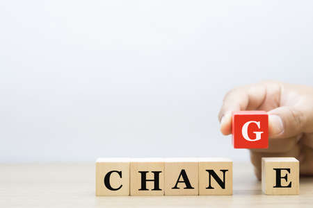 Word Change spelled with wooden dices with the dice carrying letter G turning to spell the word Chance.