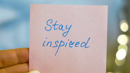 A hand displays a pink sticky note with the words Stay inspired in blue ink against a blurred background