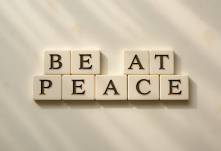 A serene arrangement of letter tiles spelling BE AT PEACE on a white background, evoking feelings of tranquility and positive energy suitable for relaxation themes.
