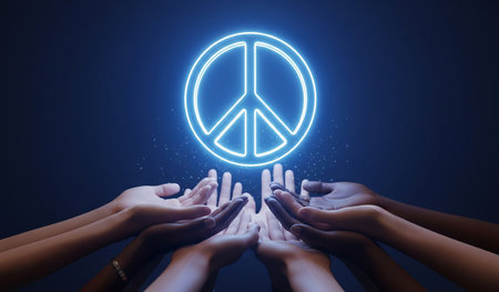 People from diverse nations and backgrounds displaying peace signs to promote unity and collaboration among different religions and cultures in an inspiring solidarity moment