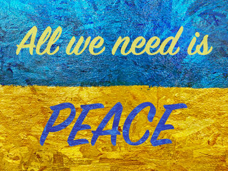 message All we need is Peace on Ukrainian flag painted on wooden wall