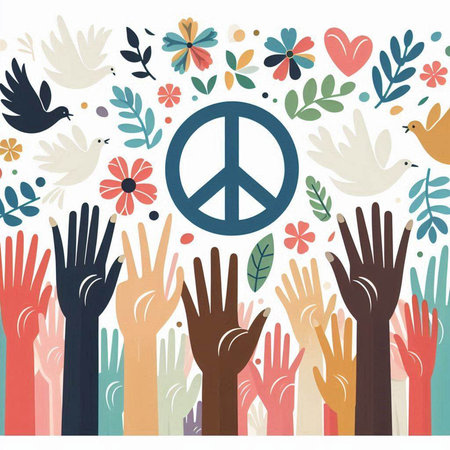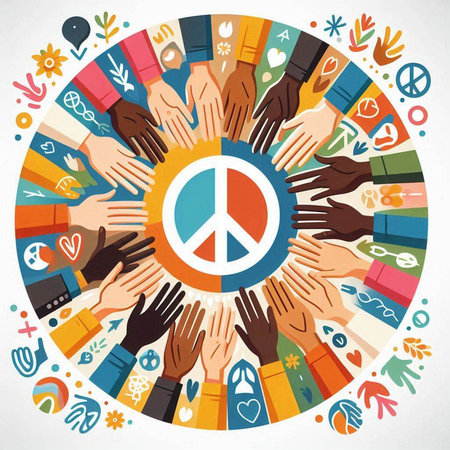 Vector illustration of hands around peace symbol in circle made from diverse people hands.