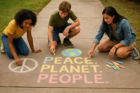 Three young individuals drawing peace themed chalk art on a sidewalk, promoting harmony and environmental awareness with vibrant colors
