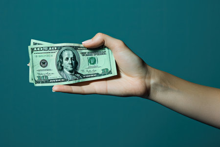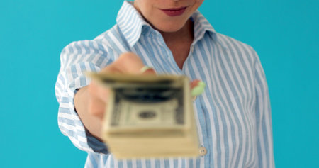 Woman hand holding and giving money. World money concept, close up of USD banknote, photo of American Dollars currency. Hand holding money, American dollars