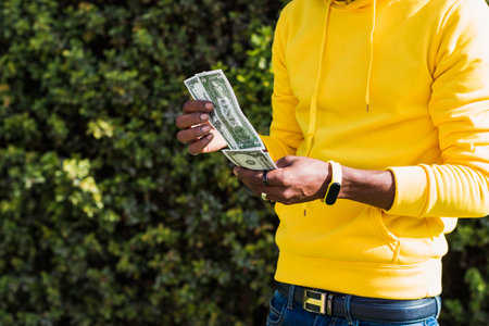 Close-up of the hands of an African man dressed in a yellow sweatshirt and unrecognizable activity bracelet holding dollar bills as he passes them from one hand to the other to count the money.
