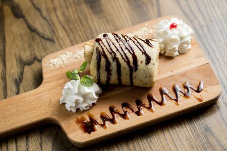 Okonomiyaki, a Japanese pizza or pancake containing a variety of ingredients served on plate with dried seaweed and dried bonito flakes