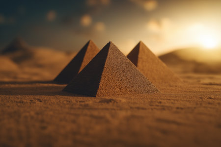 A Miniature model of ancient Egyptian pyramids in desert landscape, showcasing intricate details and textures under warm sunset glow