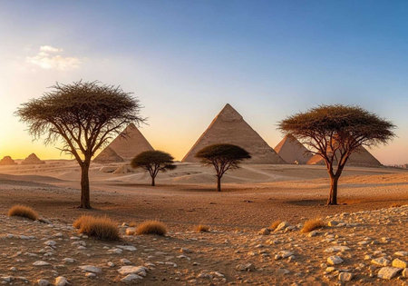 The majestic Pyramids of Giza stand tall in the desert landscape at sunset
