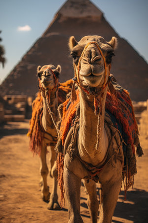 portrait of a camel head close-up against the background of the Cheops pyramid in Giza Egypt without people