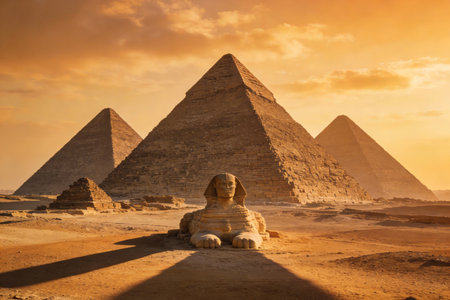 The majestic Pyramids of Giza stand tall in the desert at sunset