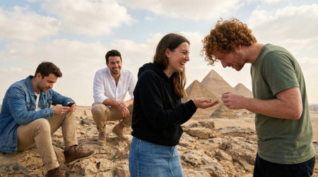 A group of young tourists enjoy their vacation in Egypt, with a couple examining a stone in front of the Giza pyramids while their friends relax in the background.