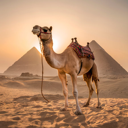 Camels tread through the golden dust at Giza, with the sun casting its last rays over the pyramids, creating a timeless scene