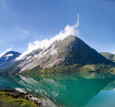 Amazing view of Breiddalsvatnet lake with reflections. Skjåk, Innlandet, Norway
