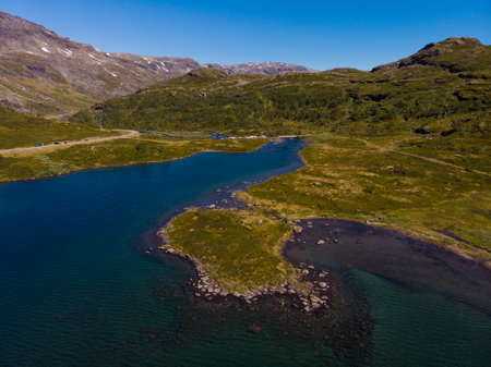 Aerial view. Green summer landscape with river and lake in Hallingskarvet National Park, central Norway. Norwegian County Road 50